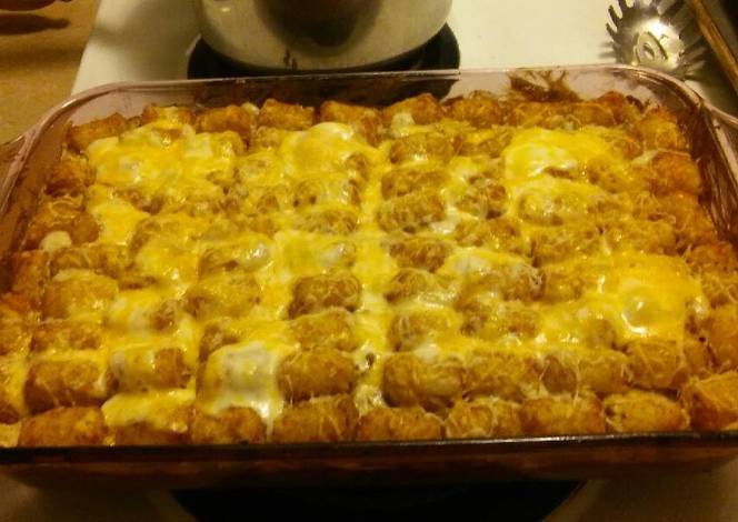 - Add a neat, single layer of tater-tots to the top of the mixture .