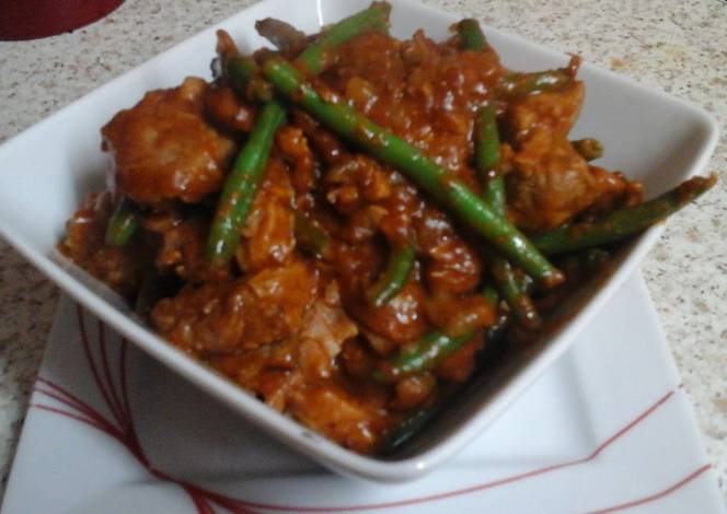 - Add the soya sauce and stir in and then the green beans simmer for 2 minutes