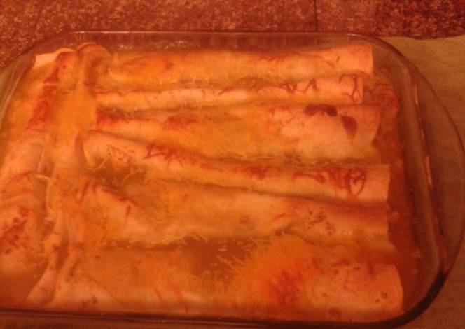 - Put in filled tortillas in large baking dish. Pour last can of enchilada sauce on top. Then sprinkle remaining cheese on top