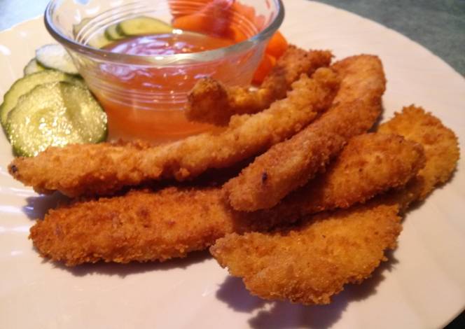 - Slice your chicken breasts length wise. You should get about ten strips per piece.