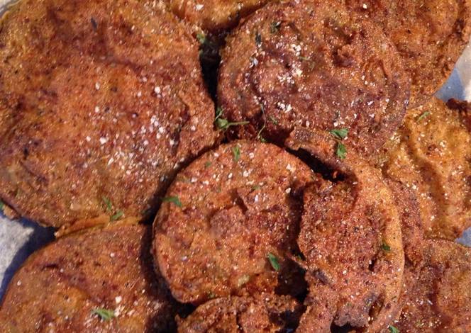 - When oil is ready dip tomato slices into mixture then into four mixture cover completely in flour mixture press flour mix into the slices then lightly shake off and put into hot oil