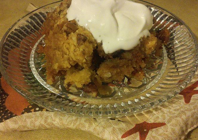 - Sprinkle the DRY cake mix evenly over the pumpkin puree, then, as evenly as possible, pour the melted butter on top and finish by sprinkling with the chopped pecans.