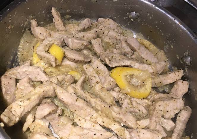 - Once butter melted and everything mixed add pork strips and seasonings (salt pepper garlic) then squeeze lemon juice over all pork strips..I cut lemon into strips to add later now to leaving one in half for next step