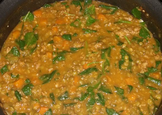 - Add vegetable stock, tomato paste, and rinsed lentils.
