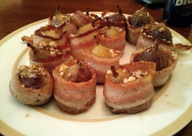 - Tuck an end of the bacon slice into the fig and wrap it around