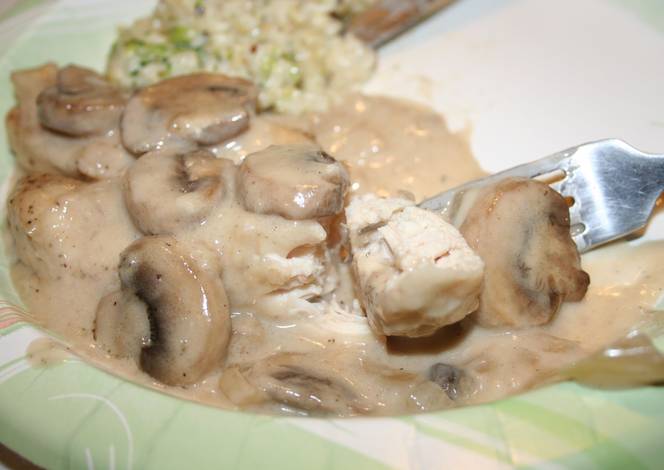- In same fry pan, melt butter and saute onions until soft. Add garlic & mushrooms and saute 1-2 minutes more until garlic is fragrant. Stir in sherry (or wine) and saute about 5-10 minutes to cook off alcohol and reduce down about half. You can substitute chicken stock or water for non-alcoholic version. Stir in mushroom soup. Using same can measure out heavy cream and add to pan.