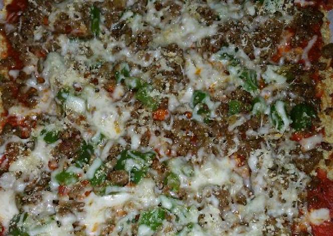 - Remove crust from oven and spread sauce. Top with sausage mixture, 1 c cheese, 3 T oil, pepper flakes, salt and pepper. Bake 10 min or until cheese melts.