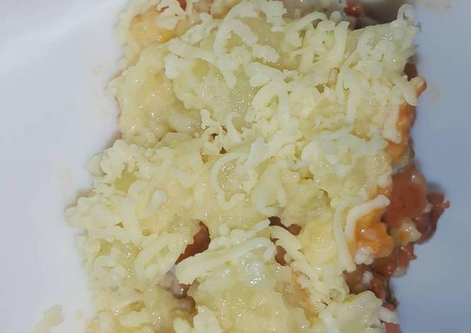 - In an oven-safe dish or bowl, put meat sauce and on top of it, layer prepared mashed potato mixture. Sprinkle with grated cheese and pop in the oven for 10 minutes at 350°.
