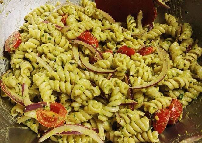 - Add the pasta to the bowl with the tomatoes along with the avocado mixture and mix together well to combine.