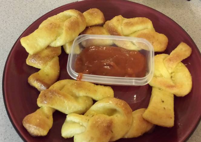 - Preheat oven 400. Spread dough out to a square. Cut into 1 inch thick strips. Shape into a knot and lay on a greased baking pan 2 inches apart.