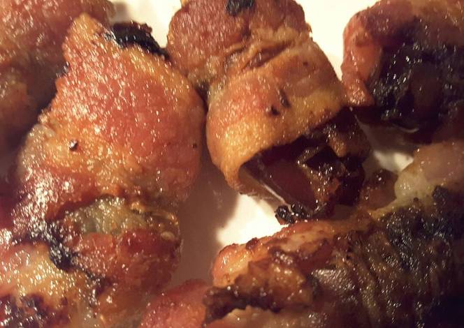 - Wrap a piece of bacon around each date. Make sure the bacon seam is facing downward and place on tray. Press firmly.