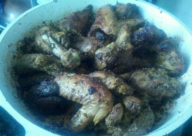- Heat a shallow pan or griddle with some oil and sear the chicken on high flame till nicely coloured. Turn down the heat and fry gently, deglazing with a little water to prevent the marinade from burning. Fry till golden brown.