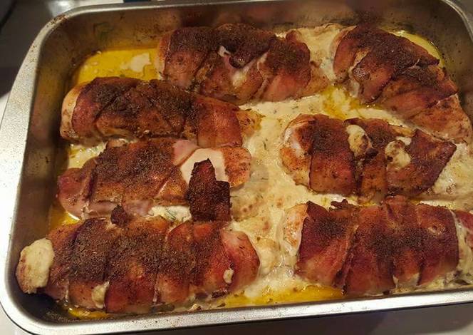 - Place stuffed and wrapped breasts into a greased casserole dish. Hold Bacon in place with toothpicks.