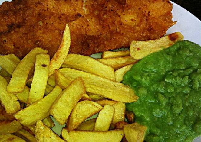 - Drain the fish & chips on kitchen paper for a few seconds then plate up with the peas and plenty of salt and malt vinegar over everything.