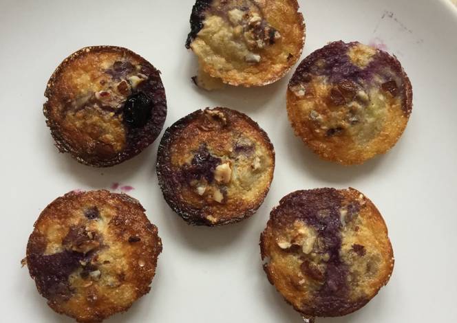 - In a small muffin pan, add 2-3 blueberries in each hole and put 2 spoons of the banana and egg mixture, add some smashed hazelnuts on top for extra flavour