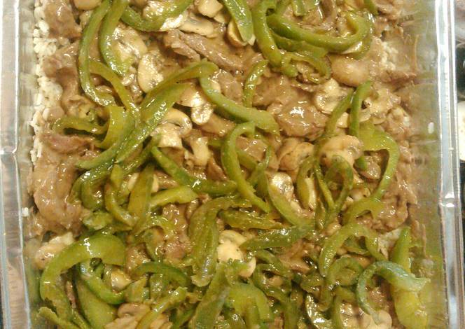 - Brown steak put in bowl add water to skillet bring to boil scraping goodies off bottom add rice simmer cover when rice done add steak then peppers on top cover and simmer 20 min serve with flour tortillas