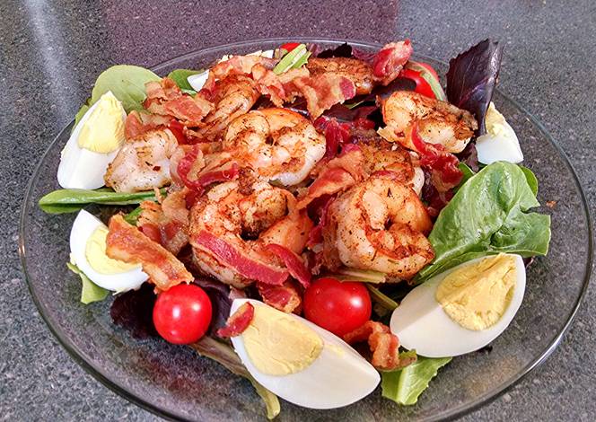 - Assemble salad, lettuce, tomatoes, shrimp, bacon , eggs, finish with dressing of your choice.