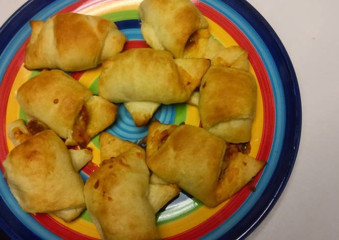 - Unroll croissants and pull apart, then add a little bit of sauce then,pepperoni, and cheese roll and, add to small baking sheet.