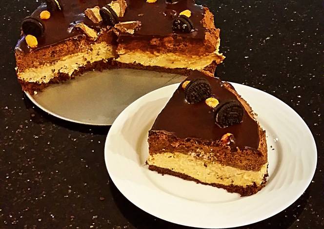- Add garnishes of mini cookies honey roasted peanuts and sliced peanut butter cups while choclate is wet so they dtick. Refigerate at least 1 hour before slicing.