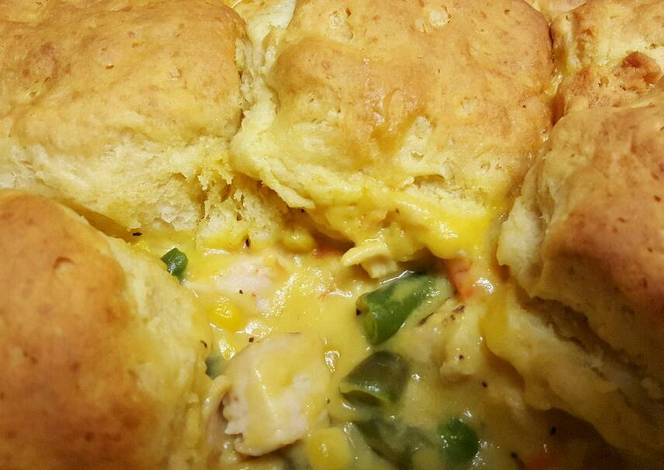 - Take the casserole dish out of the oven and layer the uncooked biscuits on top of chicken and vegetable mixture.