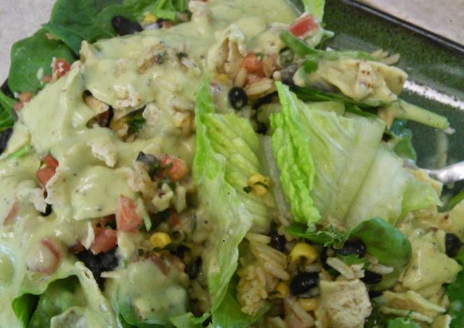- Add taco bowl recipe to lettuce or spinach. Top with guacamole and salsa. Then add dressing!
