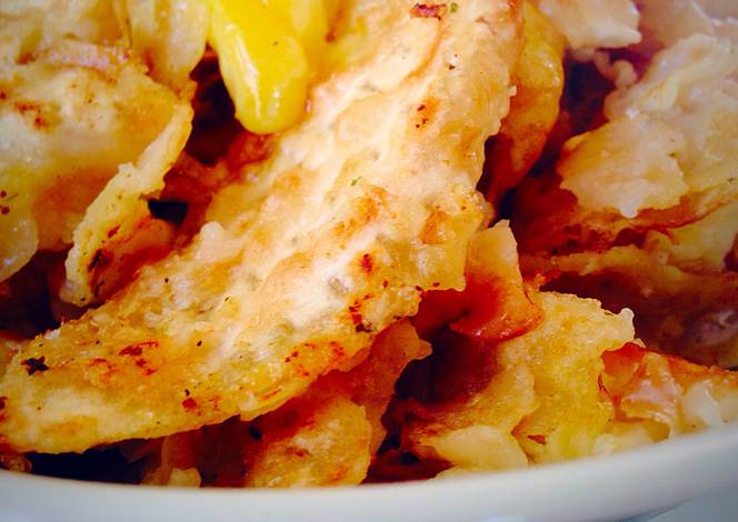 - Add hot water to broken pieces of matzo and let steep until soft but tender. Strain mix with egg white and fry in hot oil until crispy, and most of moister cooked out. Season to taste. Cook egg yoke and serve on top.