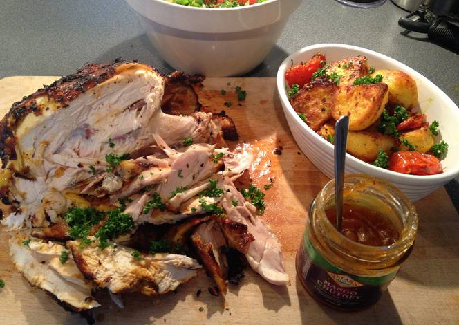- Slice the chicken and serve with the potatoes and salad, with chutneys and yogurt and lemon wedges if you wish.