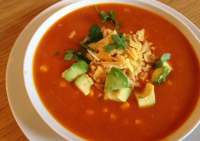 - Now prepare the garnish. Chop the avocado and squeeze the lemon over the top, grate the cheese and mix it with crushed tortilla chips. Chop the parsley. Ladle the soup into bowls and sprinkle over the toppings.