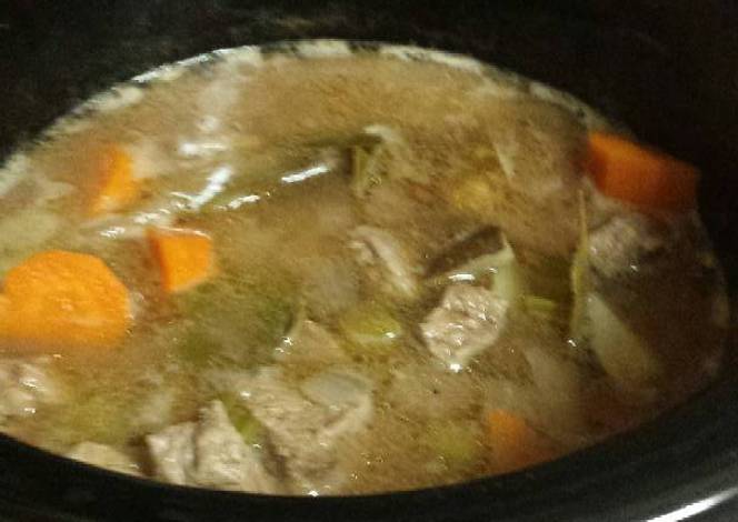 - Chop veggies and stir into the slow cooker. Add beef broth and cook on high for 6 hours or cook on low for 10 hours.