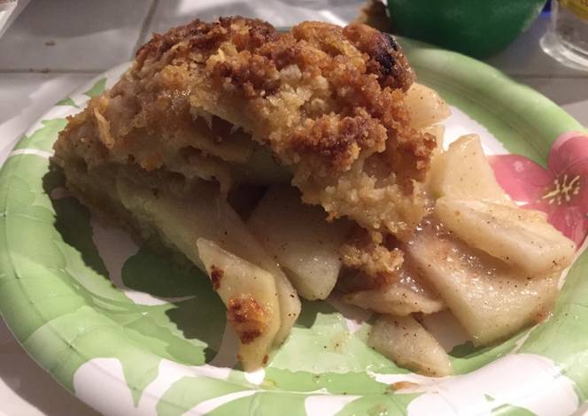 - Then press the topping onto the pile of apples (easiest way is to grab a hand full and press it on) making sure all the apples are covered. It"s going to make a mess and fall off, you"ll have to wipe the topping off the cookie sheet and add it back to the pie. (Wipe cookie sheet with paper towel when done - keeps butter from burning in the pan)