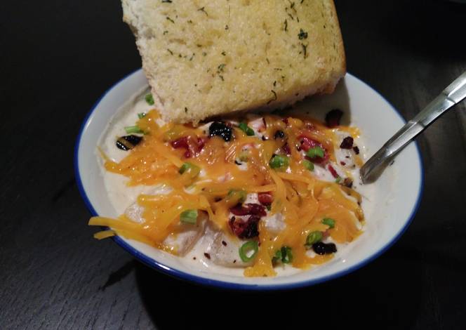 - Crush the crispy bacon you made earlier into tiny bits. Serve the soup in a bowl with cheddar cheese, green onion slices, and the bacon bits as garnish.