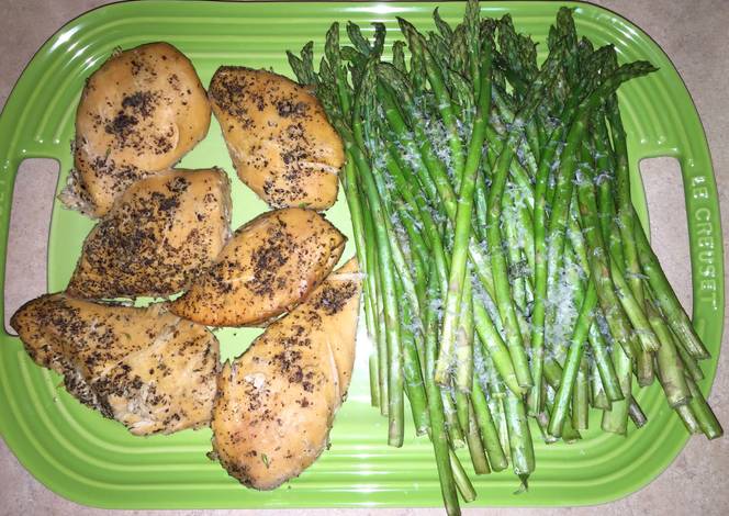 - Rinse Asparagus and pat dry about an hour before chicken is ready to serve. Lay across top of chicken. Season to your liking. Cook for remaining 45-60 minutes depending on how crispy vs soft you like it. It will steam to a perfect crispness for you.