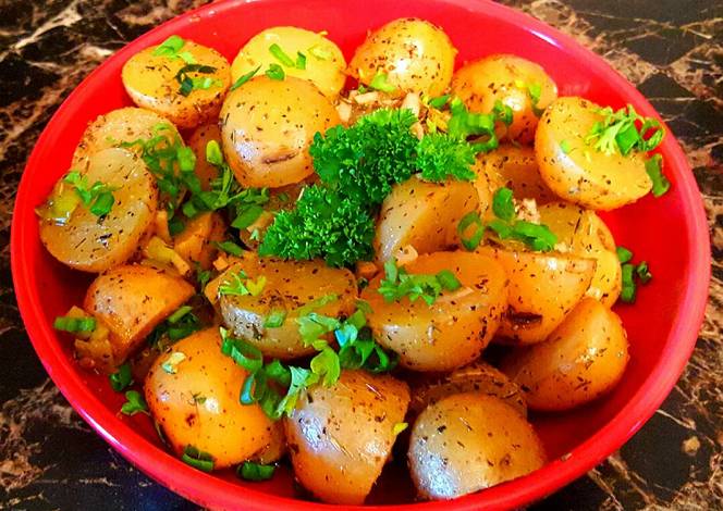 - Rinse, dry and halve your spuds. Coat potatoes with garlic olive oil. Chop your onions and mince your garlic. Mix everything together except for garnishes and reserves.