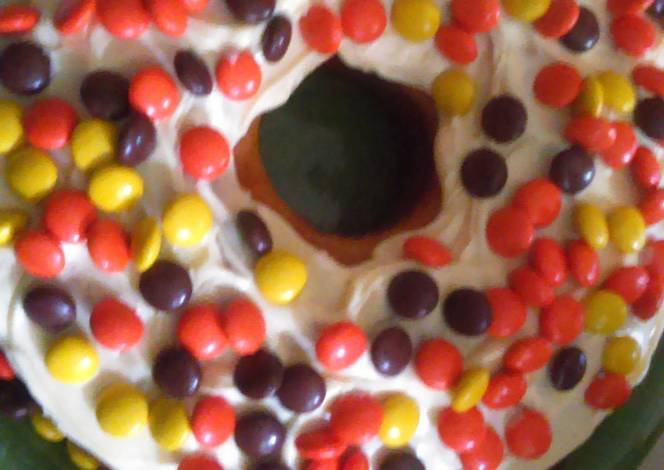 - Take out let cool and,add the icing and,candy.