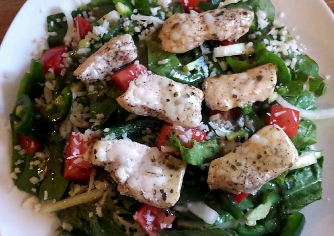 - Plate lettuce, spinach, tomato, and onion. Arrange chicken, and sprinkle cheese. Drizzle dressing over top.
