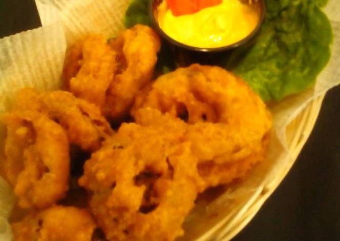 Dredge onions in dry then incorperate into wet batter fry in 325° fry olater