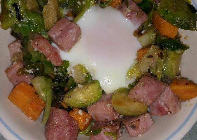 - Stir in ham. Use spoon to form four evenly spaced wells in mixture. Crack an egg in each well. Sprinkle cheese on top.