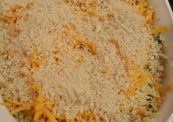 - The combine all together in a prepared casserole dish. Stir in some shredded cheddar cheese if you like and maybe some pads of butter. I like to add some cheddar cheese to the top and a little Panko for crunch. This is what mine looked like just before the oven