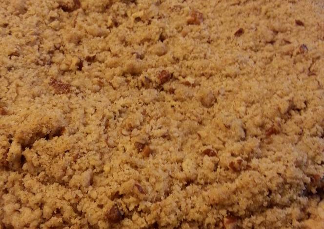 - Meanwhile make the crumble. In a mixing bowl whisk together flour, sugar, br. Sugar , cinnamon, salt. Mix together. Add cold butter use a fork to cut butter into mixture intil it resembles small crimbs. Stir in pecans.After 35 minutes. Remove from oven. Sprinkle topping on top of pie.