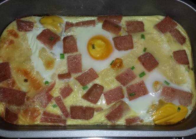 - Layer in hashbrown, cheese slices, emmental cheese & diced spam / luncheon meat