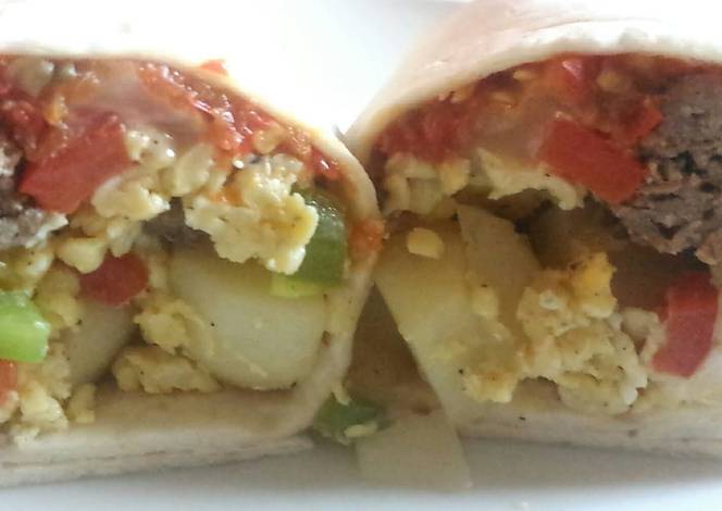 - Plate tortilla, then sauce, cheese, beef, and egg mix. Wrap with both ends closed.