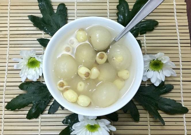 - Add 100g of smashed rock sugar into the saucepan, cook over low heat and wait until totally dissolved (about 5-7 minutes), pour the boiled seeds into a bowl to be quickly cooled off. Put the saucepan back onto the heat, add 1 or 1/2 bowl of water and 50 g of smashed rock sugar, bring this to a boil until the sugar is completely dissolved, turn off the heat to let the syrup cool off. (To have a sweeter syrup, add 100g of rock sugar). The total amount of water we use for 2 times is 600-700 ml. This dessert should be just a little sweet because the longans are already sweet.