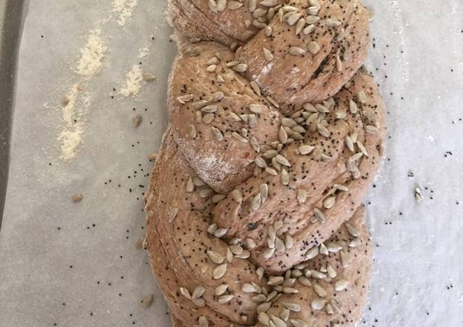 - Once it"s done, remove the dough. You can then put it into a bread pan that has been greased or you can make a round loaf or you can plait as I did in the photo. If you want to plait, cut the dough into 3 with a large knife. On a lightly floured surface, roll each piece into a sausage and then plait.