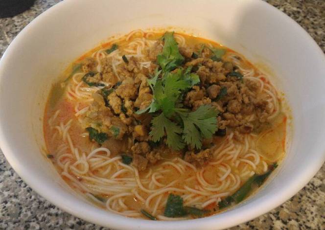 - Add the hot noodle water into thr bowl and mix till the soup no longer has lumps add the noodles and put the stir fried pork on top and garnish with some cilantro