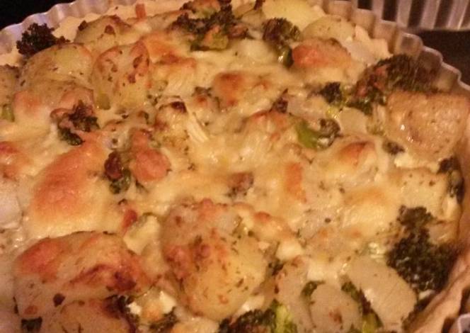 - Drain the almost-cooked potatoes into a colander. Put the broccoli into the hot pan and then return the potato to the pan. Add the onions / garlic and stir all the vegetables together with half of the grated cheese. Add the seasoning (salt, pepper, ground nutmeg, chopped parsley) and mix in thoroughly.