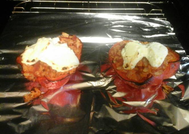 - Spoon the mix into the pepper halves and top with the goats cheese. Cook for a further 15 mins at 200°c or until the cheese starts to colour and melt