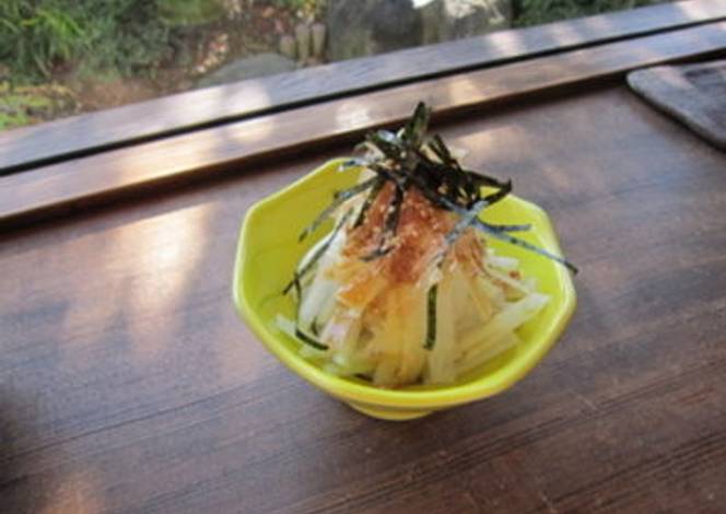 - When daikon is crispy, drain the water, add tuna, bonito flakes and nori seaweed.