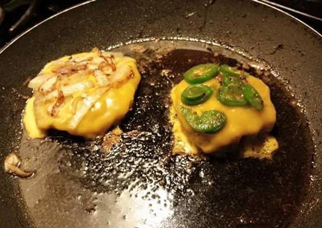 - When burger are about a minute or so from being done add more sliced jalapeño the cheese and let it melt.