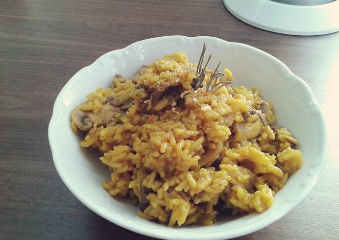- Heat some oil in a pot over medium high heat. Add shallot and turmeric, fry until the shallot is translucent, then add mushrooms