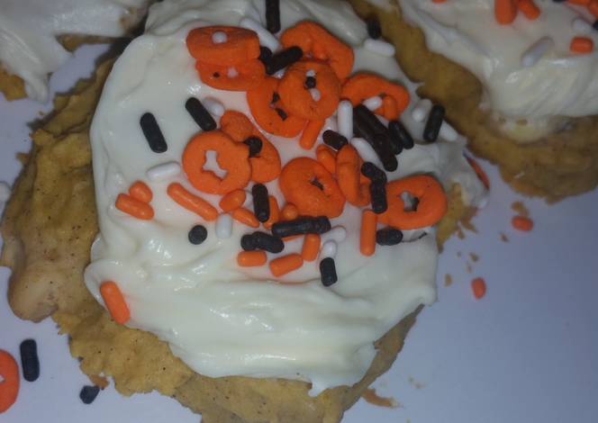 - Once they are cooled slather some cream cheese icing on top and dash on some sprinkles